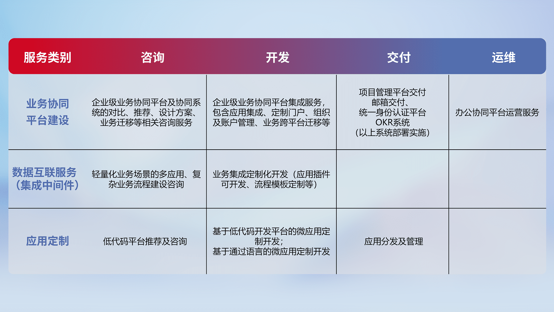 针对钉钉、、、企微、、、IDaas等平台级产品提供产品的规划、、方案、、交付、、、定制化开发等服务,,实现如统一协同办公、、智能客户服务、、混合会议管理、、智能数据查询、、、等业务场景,,,,实现数字化转型。。。。
