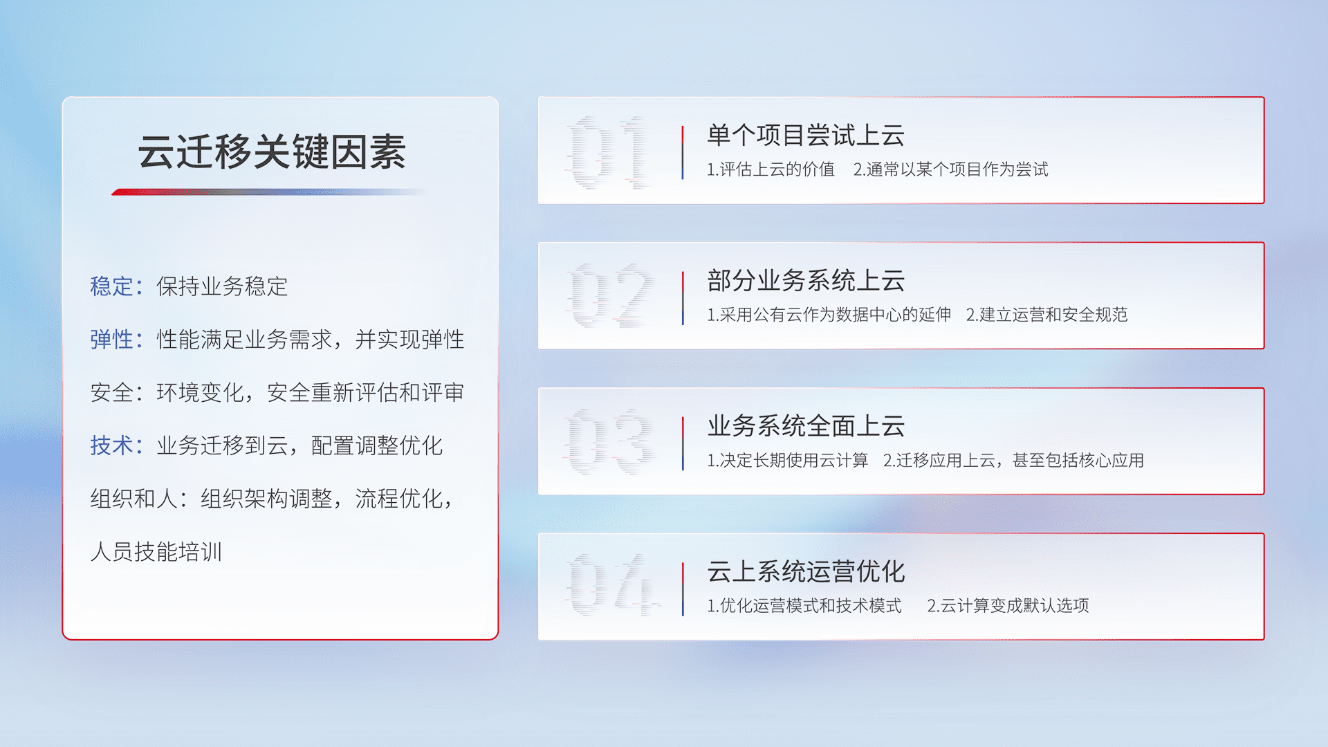结合实际业务,,,,从规划设计、、、云平台选型、、、、云原生改造、、、、数据迁移、、、、集成交付,,,迁移全过程为客户识别最佳上云路径,,做好风险识别管理,,设计网络架构、、、身份权限、、安全审计合规、、、、操作审计、、、日志审计、、、、监控告警策略、、多站点容灾设计等,,,,对云上基础设施进行整体规划,,,,提升IT治理水平,,,以满足弹性、、、、高可用、、高性能的需求。。。