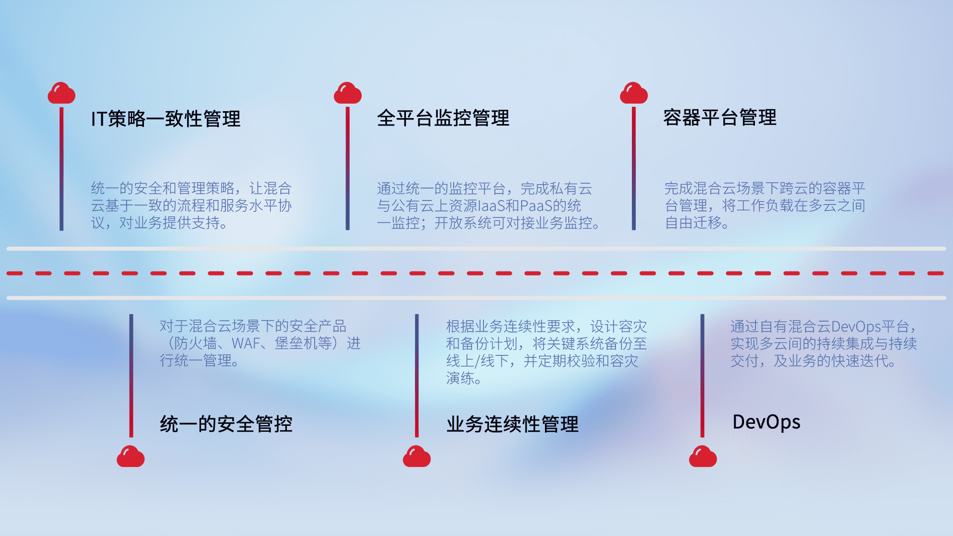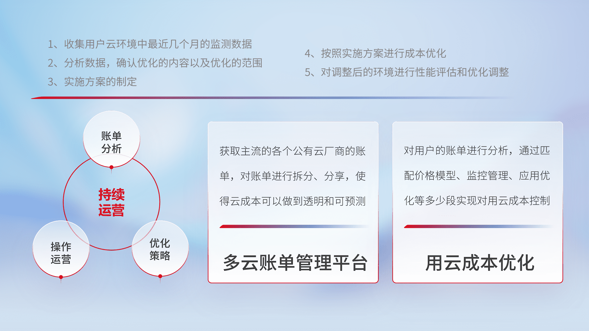 通过多云纳管,,,以统一的资源数据模型把客户的云资源进行抽象和封装,,进而实现对多云资源的统一操作,,,,保障云资源管理的可靠性、、稳定性与可用性。。。。量身定制化运维内容,,,,配置、、、开发运维、、补丁管理、、备份、、监控、、、认证和访问管理、、、、审计和日常巡检等,,,保障在用云过程中的可靠度,,稳定度以及高可用率。。。