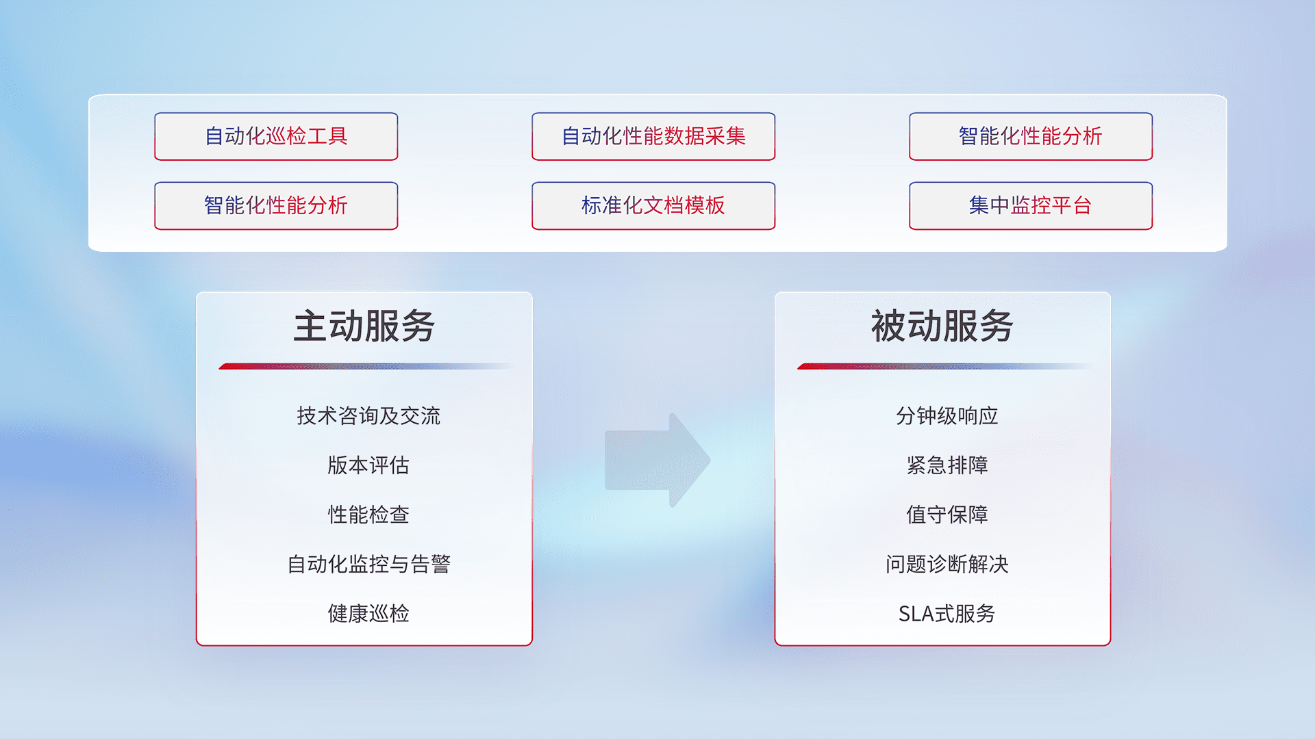 智能化工具和标准化文档,,,保障服务质量,,提供主动服务(包含技术咨询、、、版本评估、、、、性能检查、、、自动化监控与告警、、健康巡检)和被动服务包含(分钟级响应、、、紧急排障、、、、值守保障、、、问题诊断解决、、、SLA服务)。。。。